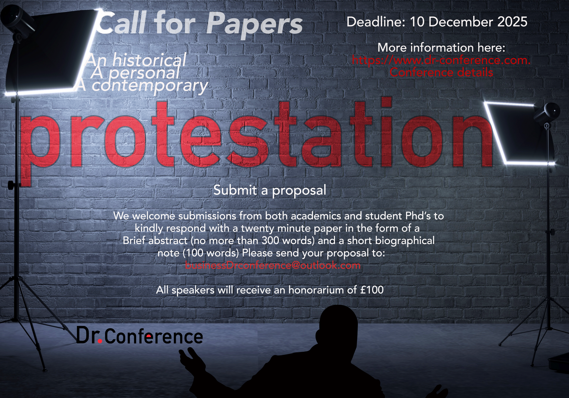 The theme for the upcoming conference is protestation, a term that can be interpreted in various ways. Specifically, it refers to a formal, emphatic, and solemn declaration of objection, affirmation, or dissent. Dr. Conference would like to encourage you to align your research within the framework of the noun protestation, drawing upon the contexts outlined below. We invite you to explore your interpretations, no matter how tenuous the connections may seem; we are open to all creative avenues and insights. For instance, your interpretation may manifest through various mediums such as the arts, design, and music, as well as film, television, and comedy. Dr. Conference fully recognises the potential breadth of meaning encompassed within the term protestation, acknowledging its significance across different fields and disciplines. In light of this understanding, we have devised three explainers to help clarify and facilitate the mechanisms through which your proposal can effectively fit within the overarching theme: